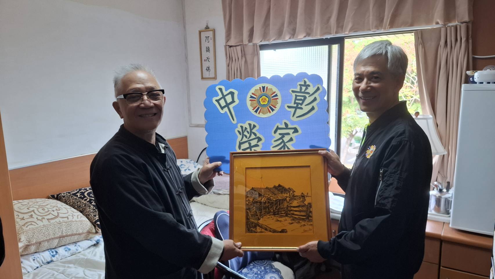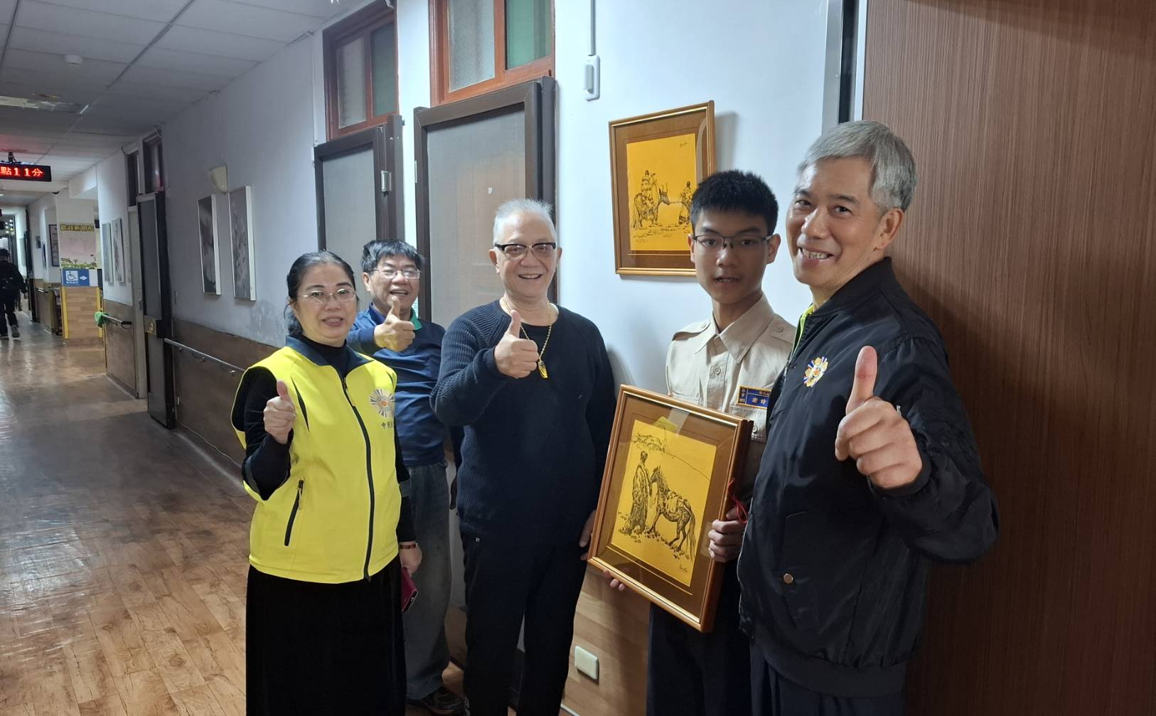 【記者呂沅龍/彰化報導】中彰榮家住民吳先生近日捐贈其於早年在大陸四川成都所購買的40幅鋼筆畫給中彰榮家,由家主任呂德義代為受贈,並懸掛於住民房舍的走廊及交誼廳空間,以美化住民的生活空間,讓更多住民與來訪親友欣賞與感受藝術的美好。榮家長輩們對於活潑、鮮明的畫作紛紛感到讚賞,並感謝吳先生願意割愛慨贈榮家布置溫馨的居家環境。
