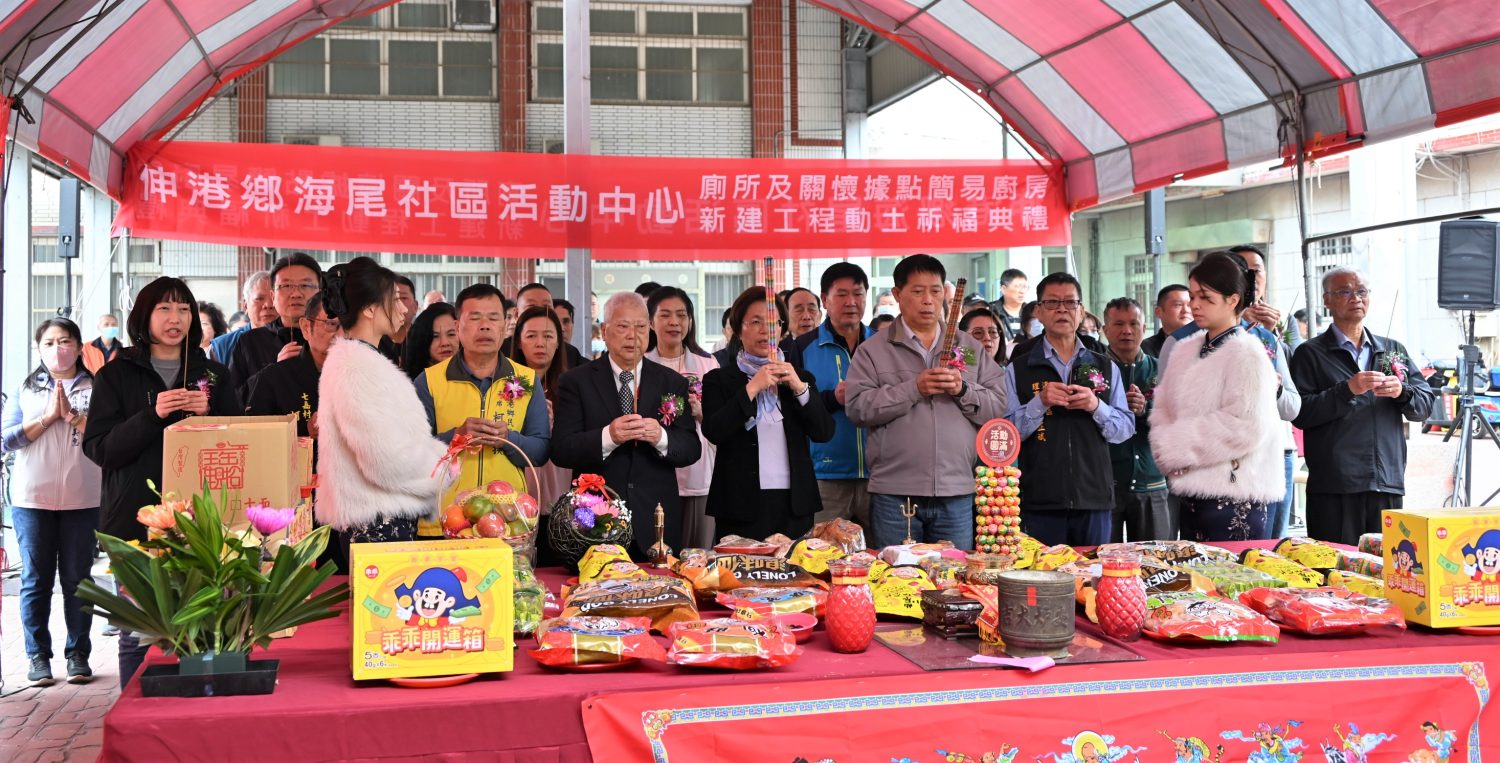【記者白孟倫/彰化報導】伸港鄉公所於今(4)日上午舉行「伸港鄉海尾社區活動中心廁所及關懷據點簡易廚房新建工程」動土典禮,彰化縣長王惠美、伸港鄉長黃永欽、伸港鄉民代表會主席柯嘉換、海尾社區發展協會理事長周正斌等人與會祈福。王縣長表示,感謝理事長周正斌與社區幹部的付出,本案工程經費由縣府補助450萬元、伸港鄉公所自籌620萬元,工程總經費1,070萬元。將興建地上2層、總樓地板面積約40坪的建物,完工後將能提供鄉親更舒適且便利的關懷據點場地及活動場所。
