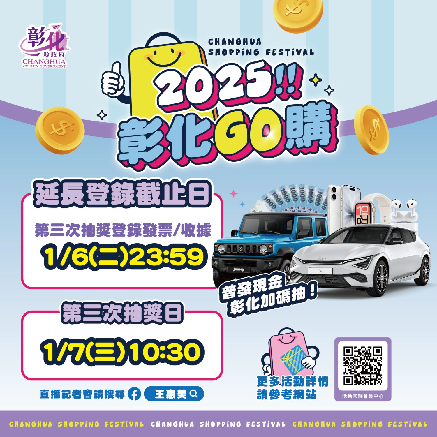 【記者施鴻全/彰化報導】「2025彰化GO購」消費登錄系統於115年1月1日因系統更新產生異常,導致民眾發票或收據無法正常登錄。彰化縣政府獲報後立即聯繫廠商修復,目前系統皆可正常運作。為保障民眾參與活動權益,將登錄期限延長1天,至115年1月6日23時59分止,並於隔(7)日進行最後一次抽獎,請民眾把握最後機會,爭取成為Kia EV6豪華電動車幸運得主,把多項好禮帶回家。